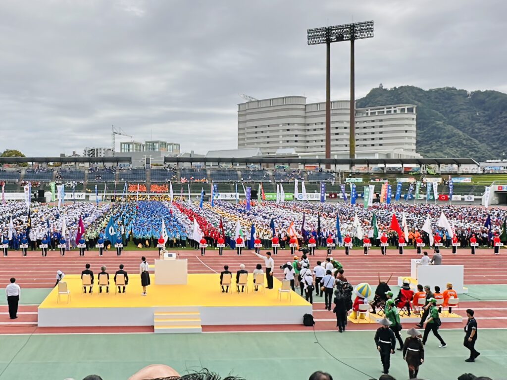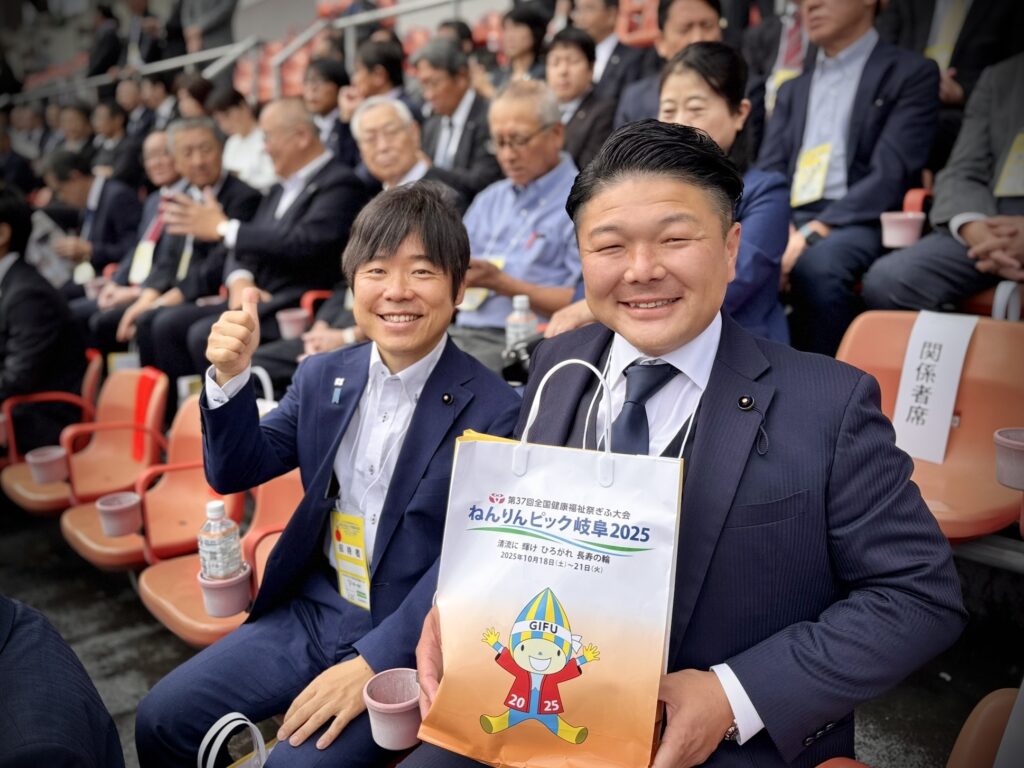総合開会式にてご一緒は静岡選手団応援のためご来場で、市議時代より友人の 畑田響 静岡市議会副議長です。県議団席では恩田県議と見守りました。