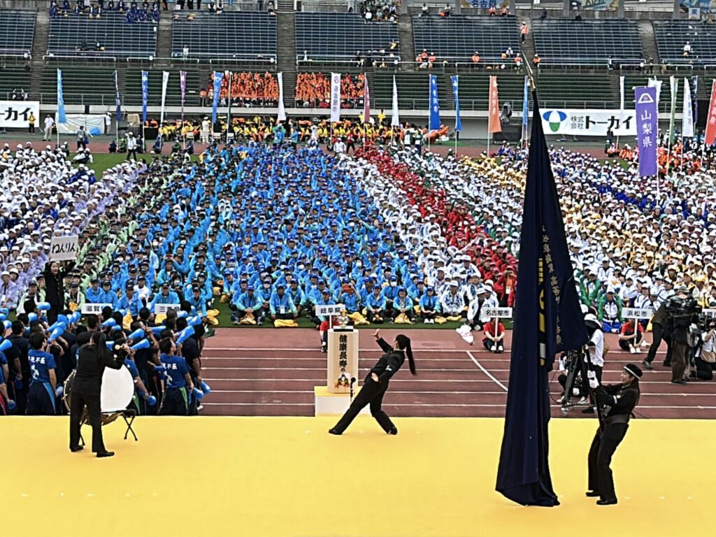 全国から来県された選手団を応援したのは母校 #県岐商 野球部と応援団、吹奏楽部です。迫力満点の開会式となりました。ぜひ清流岐阜を堪能して頂けたらと思います。