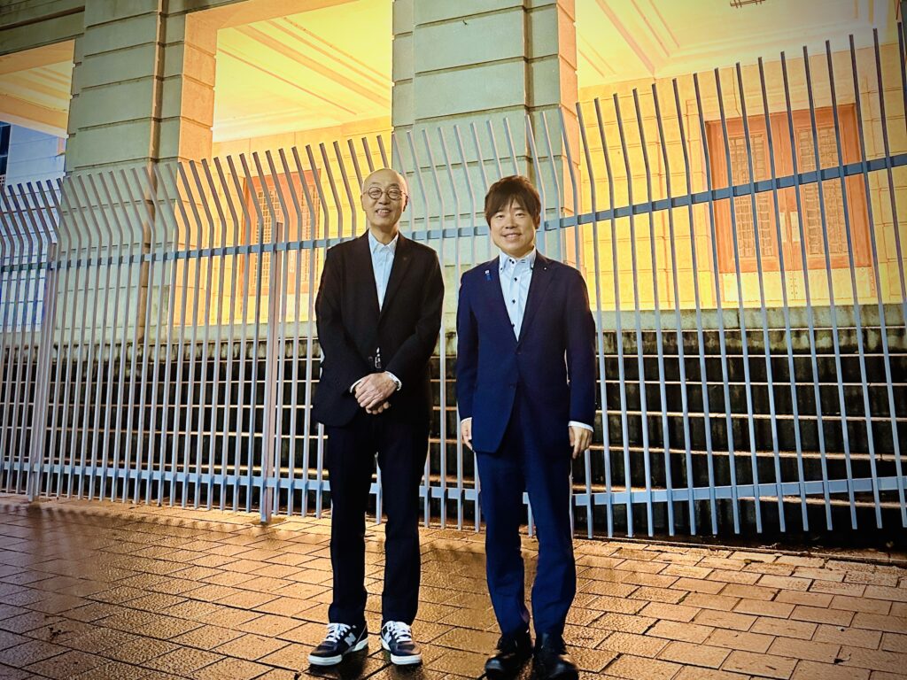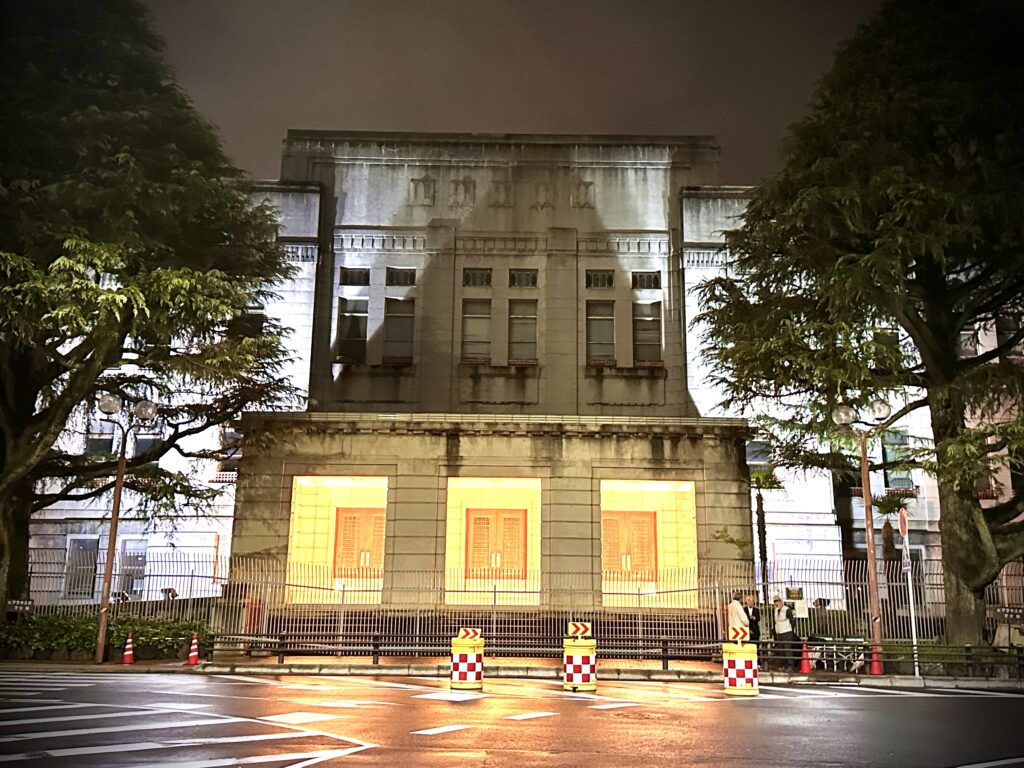 【 旧岐阜県庁舎ライトアップ( 25/10/17 fri )】#旧岐阜県庁舎 は10月15日で築101年を迎えました。これを祝い有志保存会「司町旧県庁舎保存活用協議会」が主催となり、ライトアップが始まりました。10月22日まで18時〜22時の間、点灯しています。有志の一人は同協議会事務局長でご近所の木之本公民館の石黒館長さんです。ということで、#岐阜市役所 での仕事帰りにちょうど石黒さんと古川会長さんがライトアップの立ち合い当番とのことで、偶然お会いすることができました。