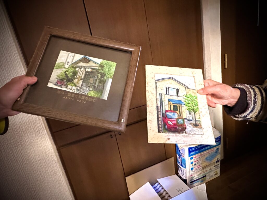 そんな記憶を胸に、京都駅から立命館大学行きの市バスを降り、授業前の時間を使って、すでに閉店された鉄平のおばちゃんを訪ねました。89歳、変わらぬユーモアで出迎えてくれた鉄平のおばちゃん、20年以上も前になります、旧店舗から家の建て替えの際に贈った記念の水彩画を今も大切に飾ってくださっていました。