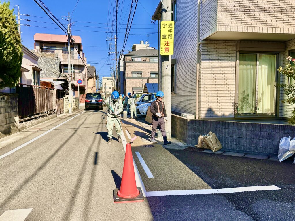 #徹明さくら小学校 通学路の整備について現場立ち合いを行いました。岐阜市が音頭を取り、自治会やPTA、青少年育成会や子ども会などで協議した通学路安全対策のWSを経て、カラー舗装対応が順調に進んでいます。