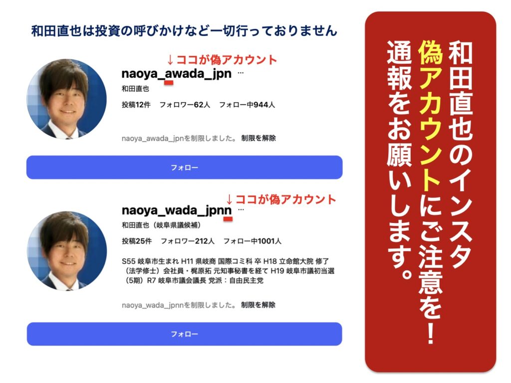 【 偽アカウントにご注意ください( 25/11/02 sun )】和田直也のインスタ偽アカウントが県議補選に立候補表明してから急に増えました。新たな課題と認識しています。もしも「無視すんの?」などと変なメールが届いておりましたら、どうかフォロー解除の上、通報をお願いします。私のインスタのアカウントは唯一「naoya_wada_jpn」です。よろしくお願いします。