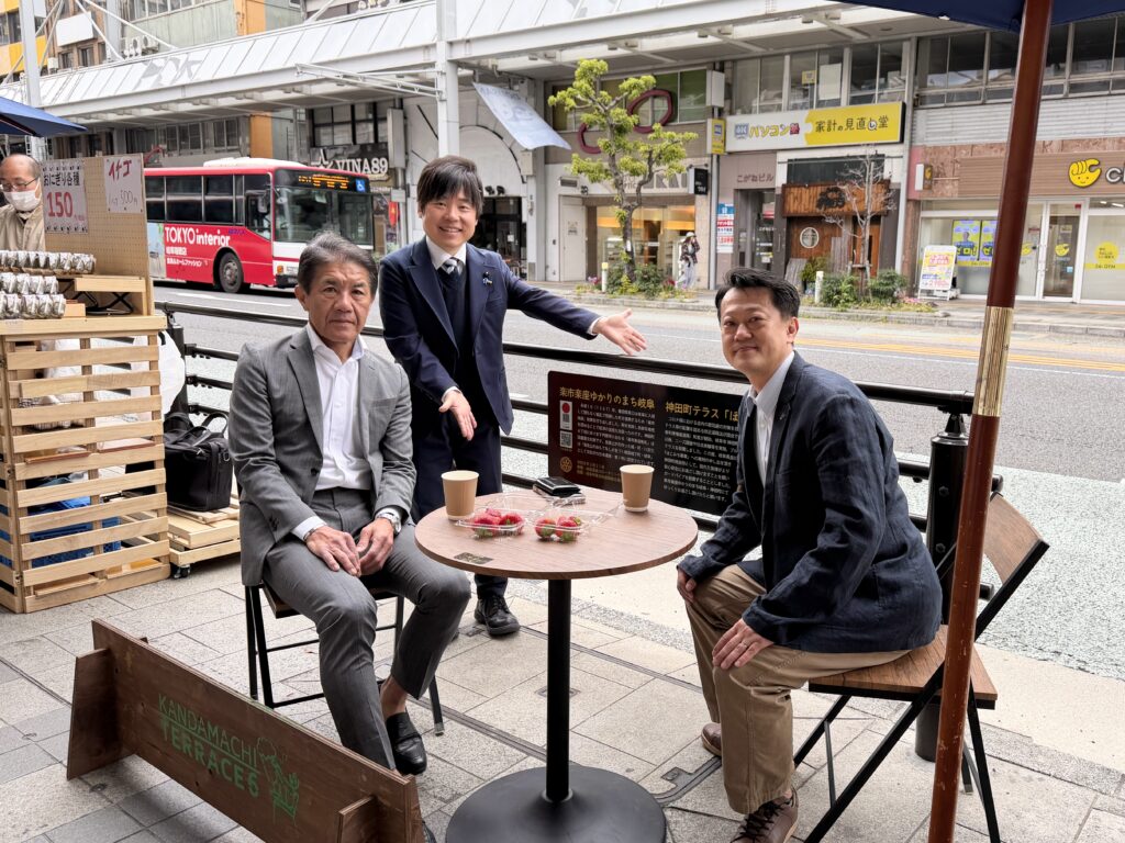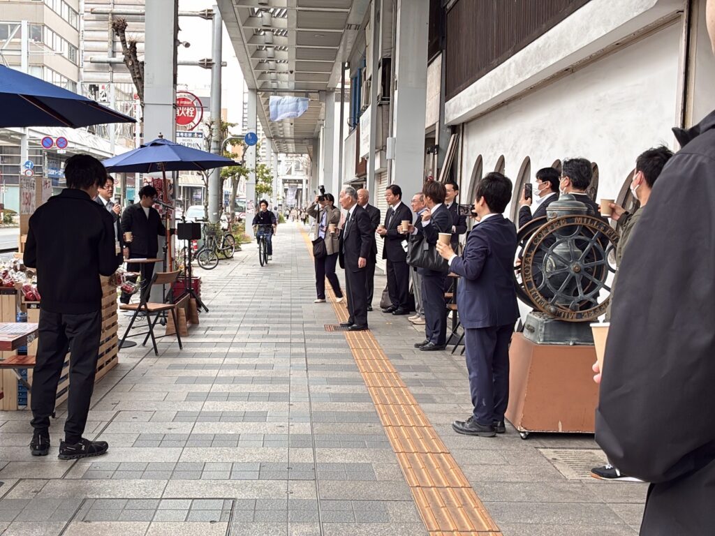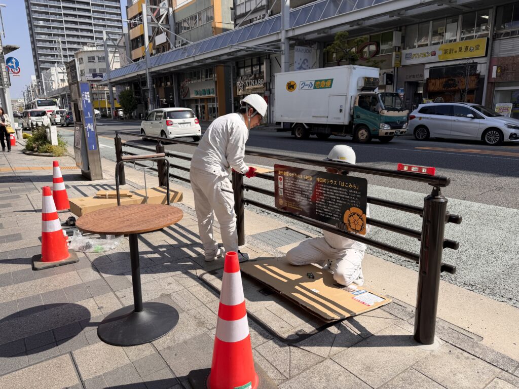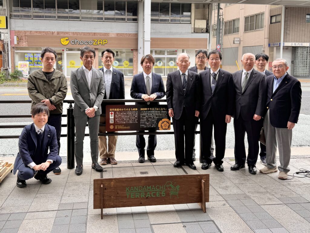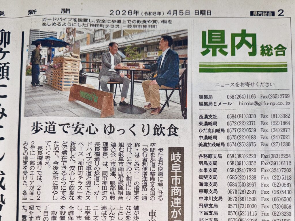 【 神田町テラス、遂に常設化( 26/04/06 mon )】#ほこみち制度 を活用した #神田町 テラスお披露目会が催されました。ここ数年をかけて神田町全域を #ほこみち (= 歩行者利便増進道路:道路法改正により制度化されたもので、道路空間にテラス、キヨスク、デジタルサイネージなどが設置できる制度)に指定、併せて加盟全店舗・事業所を訪ねて商店主のニーズ調査を実施、#岐阜大学 の協力も得て昨秋には社会実験も展開しました。県・市行政との協議の結果、事業主体は商店街(民間主導)という条件下で、常設にあたりその安全対策について協議を重ねていました。今回、#岐阜長良川ロータリー による寄附の申し出を頂き、ガードパイプが設置されることになりました。将来的には #LRT 構想が進められる過程で神田町(長良橋通り)が #トランジットモール になれば、そもそもガードパイプは不要となりますが、既に制度が運用される現況下での対応となりそうです。岐阜県、岐阜県警、岐阜市の協力を得てようやく常設化の条件が整いました。本当に嬉しいです。事業者によれば、この4本バーのガードパイプは東海地域では初めての設置とのことで、今後マニアックながら業界関係者の視察があるかも!?とのことでした。今後、こうした空間を徐々に増やすことで、#楽市楽座 ゆかりの岐阜市中心市街地にてゆったり過ごす都市空間になればと願っています。