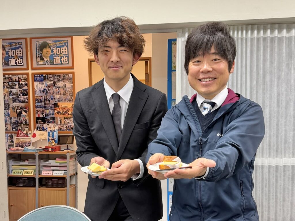 お菓子作りが趣味ということで、元剣道部のインターンを終えた彼より手作りのレモンケーキの差し入れを頂き、事務所近所の皆さんと茶話会を開きました。今回の議員インターンを通じて、早起きと新聞を読む癖ができたとのことで「インターンを終えてもまた来たい」と笑顔で語ってくれて、私もまた一つ楽しみが増えました。感謝しています。